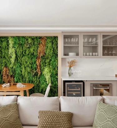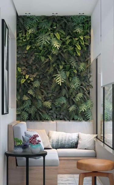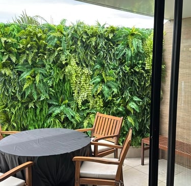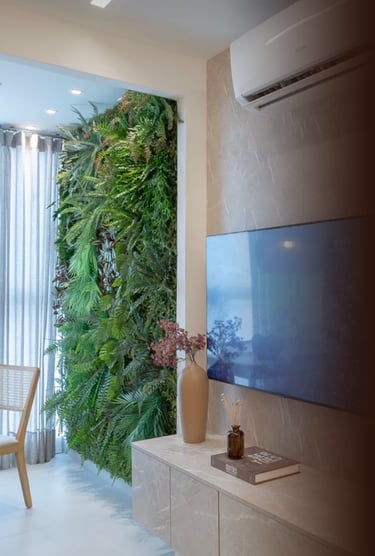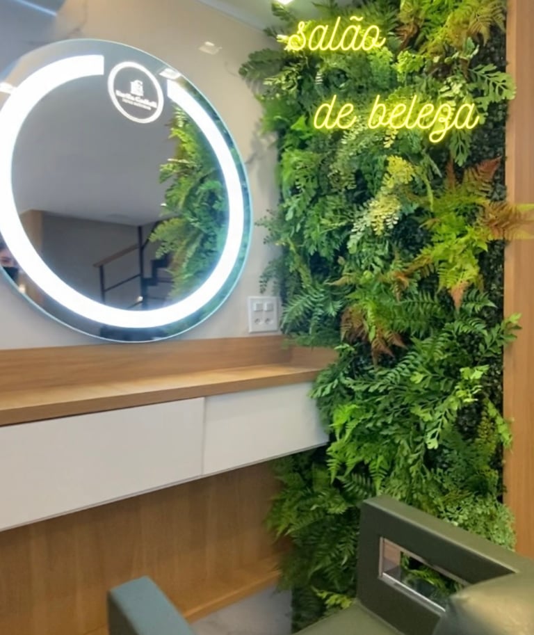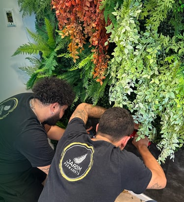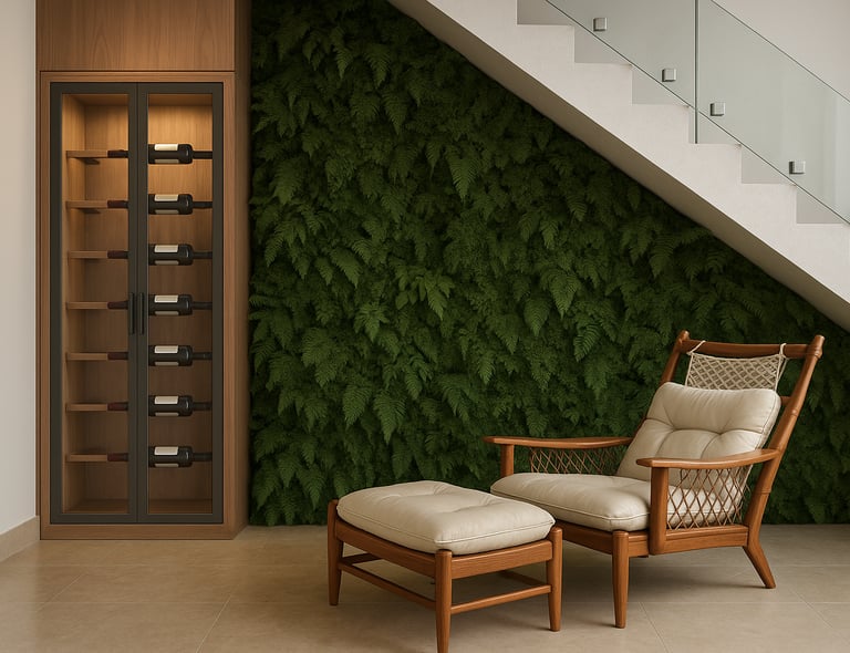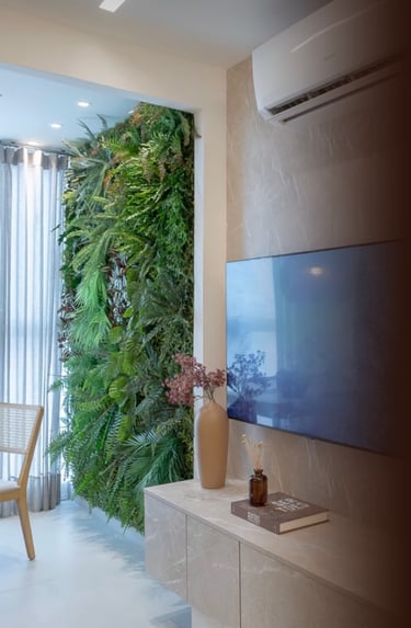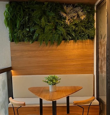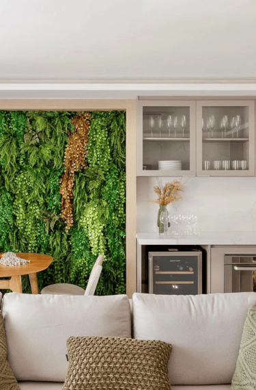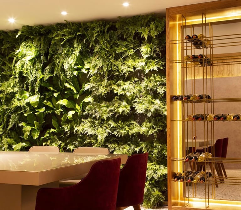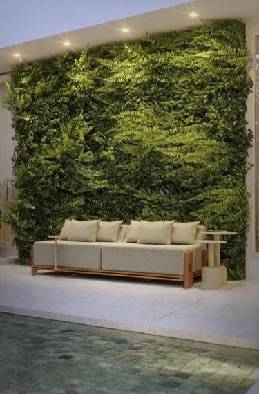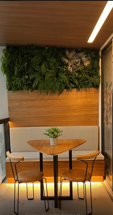 Ao incorporar um jardim vertical artificial, esse ambiente ganha charme e sofisticação imediata: o verde transmite frescor, modernidade e equilíbrio, sem a necessidade de manutenção constante.